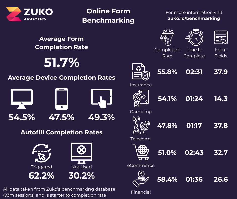 That said, we recognise that benchmarking yourself against others in your sector can be useful as long as you are cautious, and mindful of the fact that no two forms are exactly the same. This is why we have made Zuko’s aggregated data available in an open-source benchmarking repository so you can compare against sector average. This infographic should also give you a good starting point.