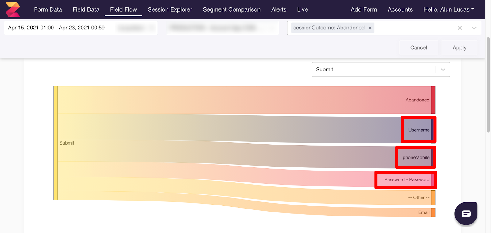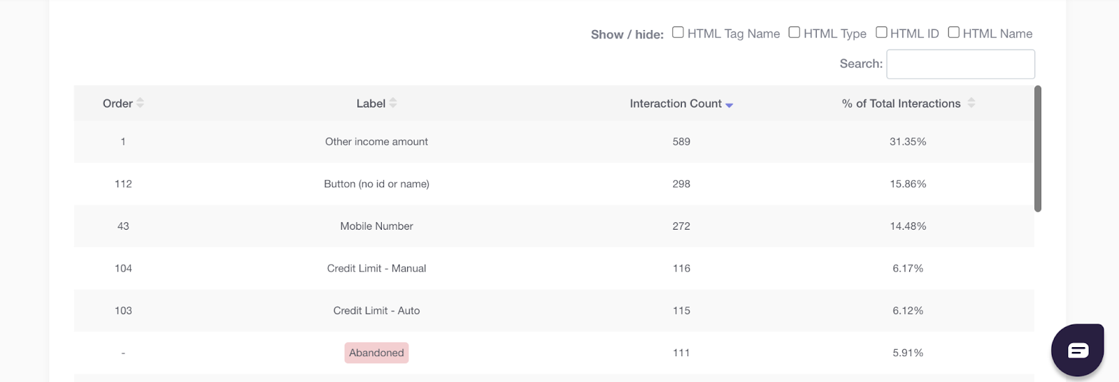 To get this insight you should set the filter to abandoned sessions only. Then, select your “Submit” button on the field selector (or the “Next” button for multi-step forms). The visualisation and table will then show you where people who did not successfully complete went next. Look at the fields with the highest interaction count. These are very likely to be the fields that your visitors are struggling with and that are driving them to drop out.